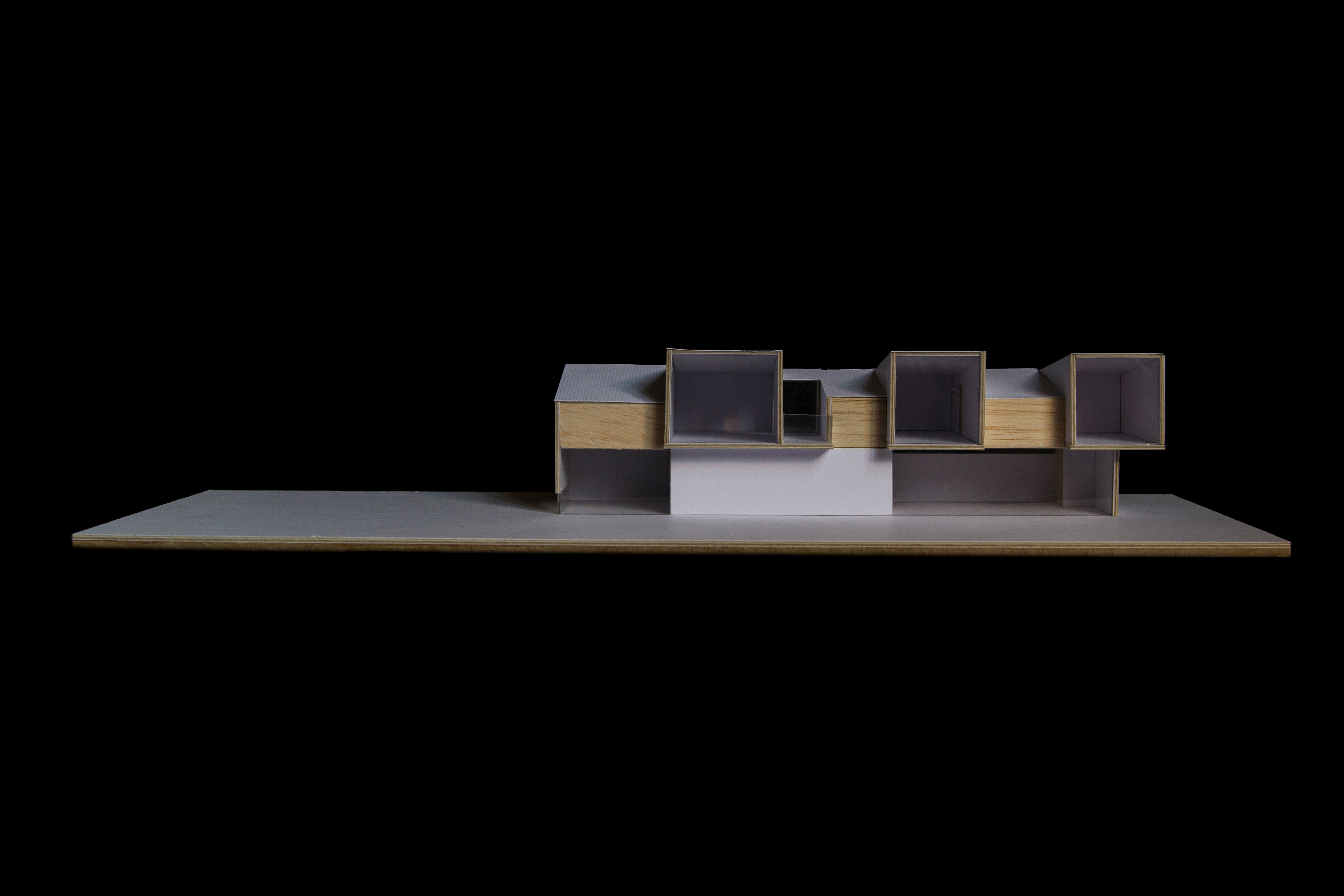 La sucesión de los 3 volúmenes que se abren hacia el norte en la planta alta no es algo casual, sino que responden a la espacialidad intencionada para el interior, sobre todo para los sectores de encuentros mencionados anteriormente. Las distintas inclinaciones de las cubiertas van brindando espacialidades diversas, y formalmente generan un lenguaje heterogéneo que va variando según los usos interiores. Se podría decir que los 3 volúmenes de planta alta con sus cubiertas hacia el norte son los espacios “privados” de la casa, es decir, los dormitorios, mientras que las cubiertas, con una altura determinada, pero con pendiente inversa, forman las dobles alturas del estar y del quincho.