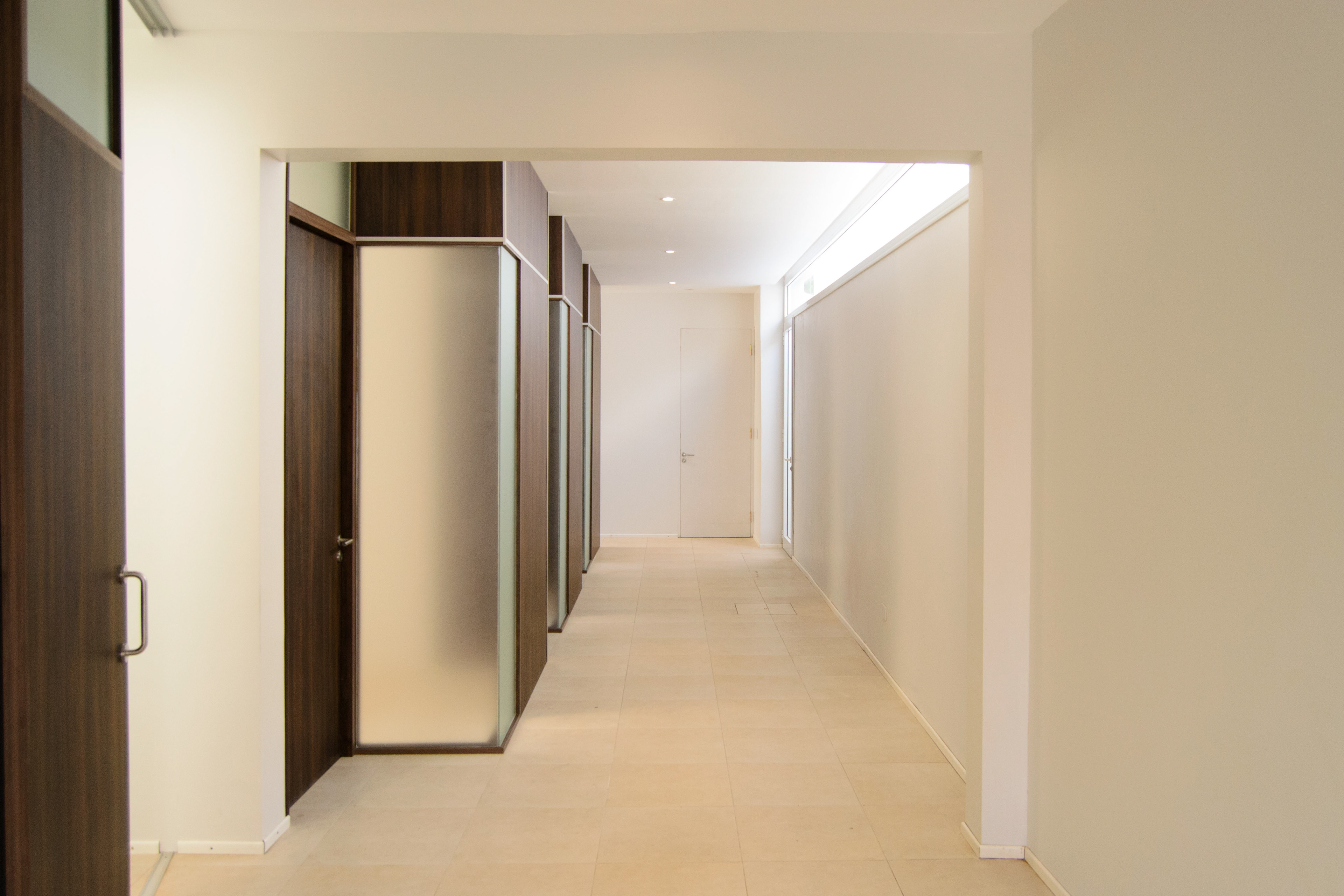 Respecto a la espacialidad interior, quisimos generar espacios más cálidos con tabiques divisorios de madera entre el sector de la sala de espera y los propios consultorios. Dichos tabiques, en su recorrido, van generando pliegues y superficies vidriadas que arman los espacios de trabajos y los ingresos de cada uno de los boxes de consultas médicas, generando un dinamismo hacia la sala de espera que hace sentir en el paciente un espacio con mayor calidez e iluminación.