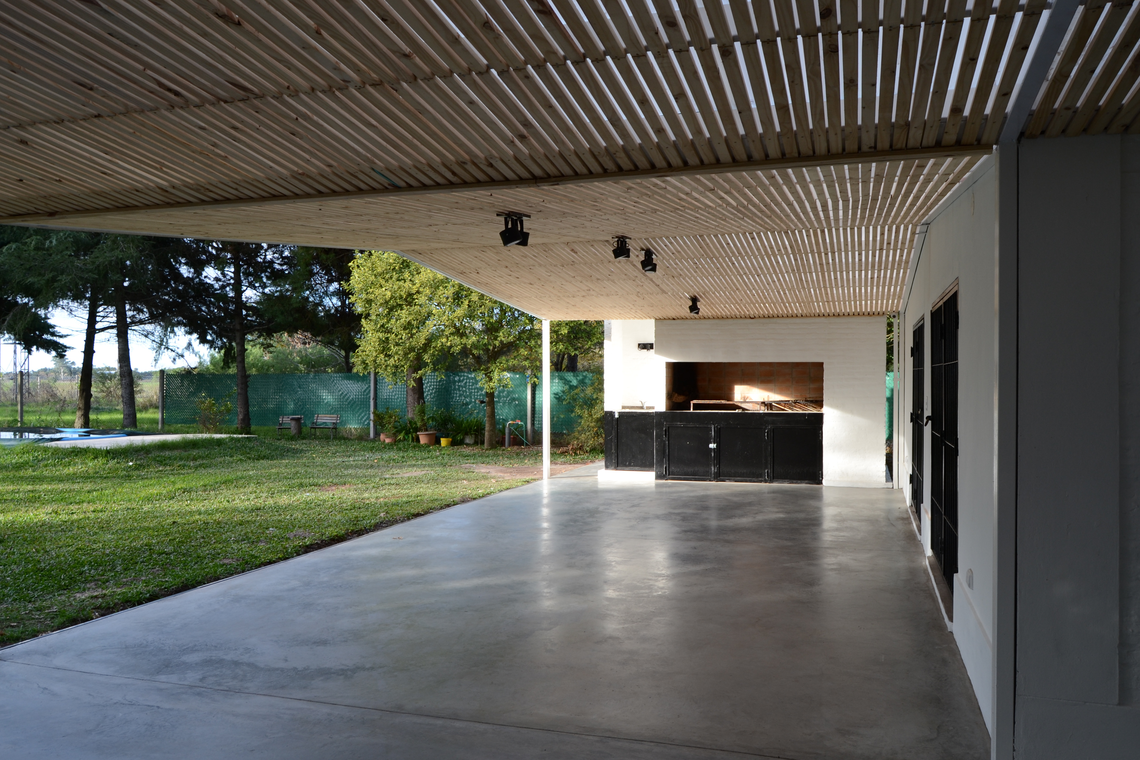 La nueva galería toma el concepto de lo tectónico, de la liviandad en contraposición a la vivienda existente, que creemos es lo que sucede en la mayoría de estos espacios de las típicas casas de la llanura pampeana. Los nuevos usos agregados (parrillero, baño y depósito), se acoplan al concepto telúrico de la casa y forman un bloque parcialmente separado de las nuevas cubiertas exteriores. Estas últimas copian la forma original de la casa en su largo, para luego dar lugar a otra cubierta cuya pendiente se contrapone a las existentes de la vivienda. Todos estos planos inclinados están cubiertos por chapa traslúcida, para permitir el paso de la luz natural.