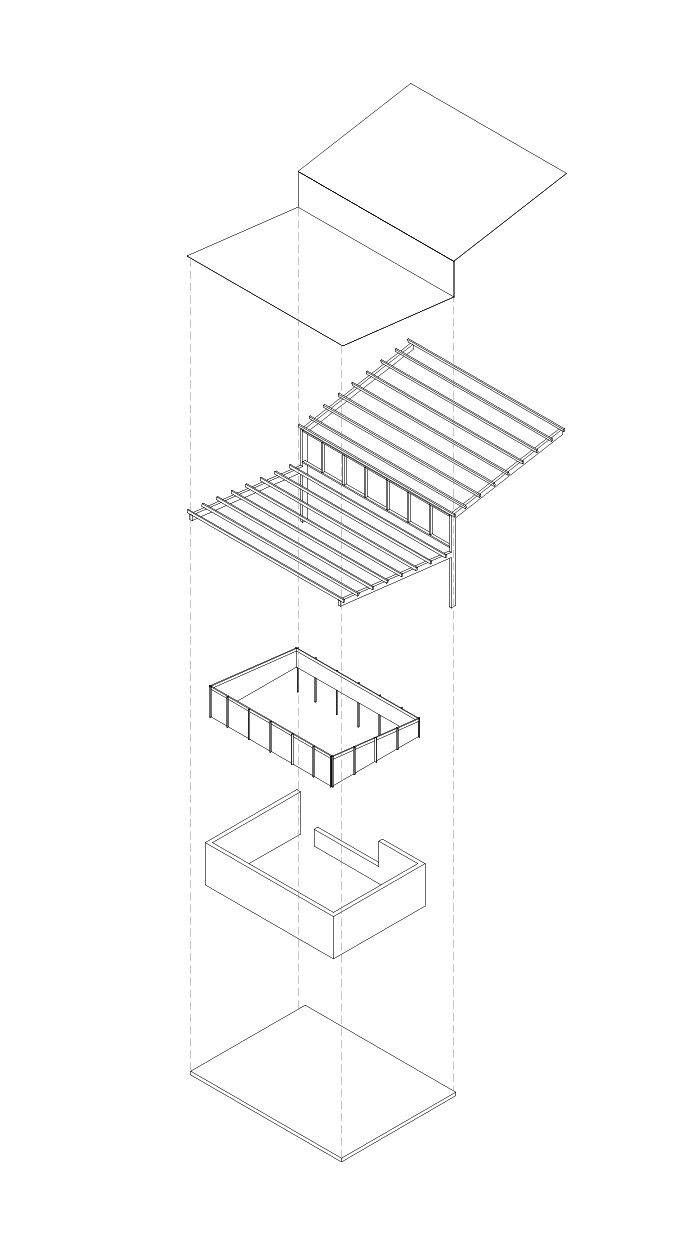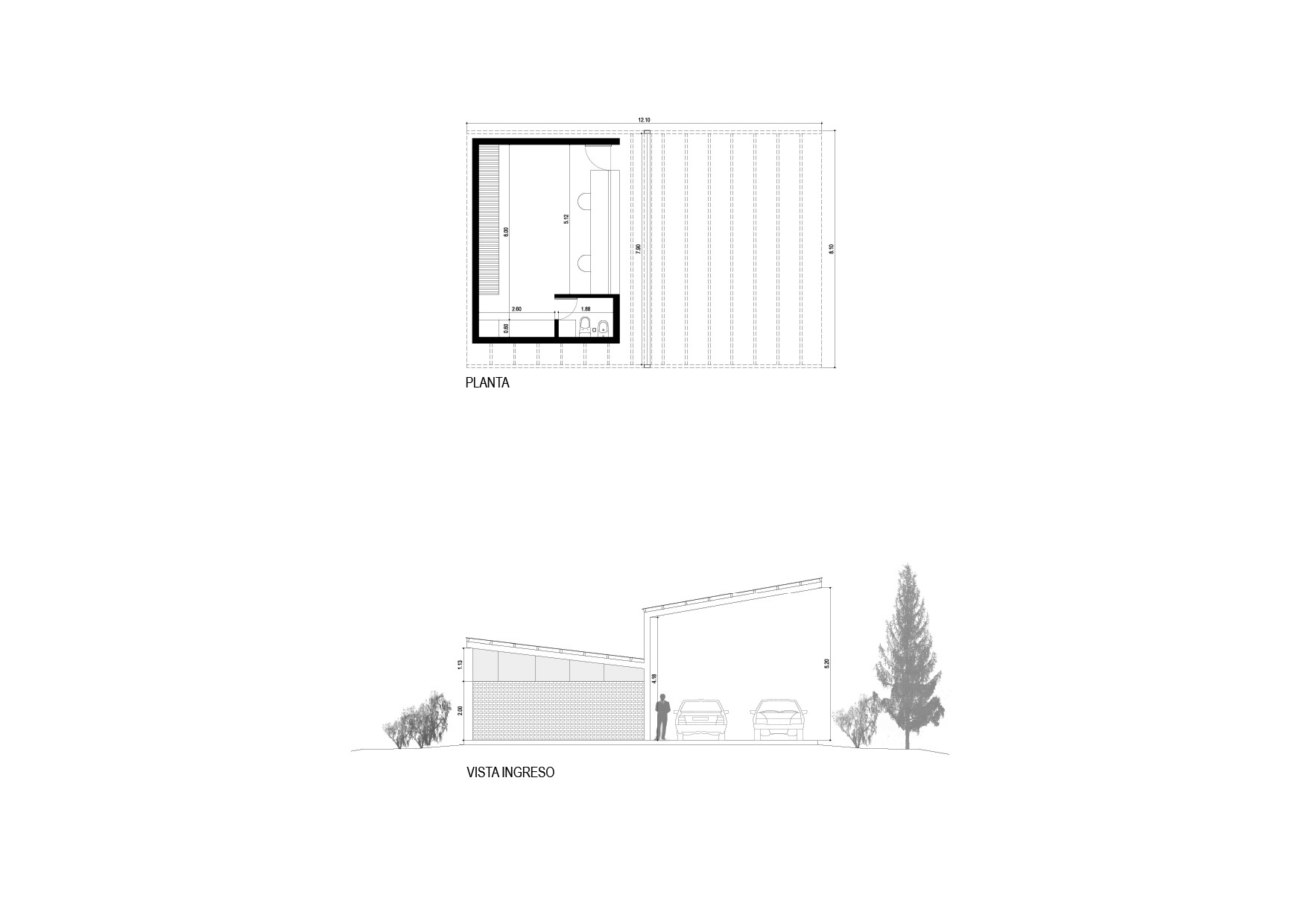 El proyecto para el ingreso a este loteo se pensó como una única estructura que haga de cubierta de dos espacios: por un lado, el ingreso vehicular, y por el otro, el espacio para los trabajadores de seguridad y/o administración del loteo. Solo dos columnas sostienen las dos cubiertas mencionadas, generando un desnivel entre ellos. La cota más baja responde a la parte cubierta, y la cota más alta a la parte semicubierta de ingreso vehicular.